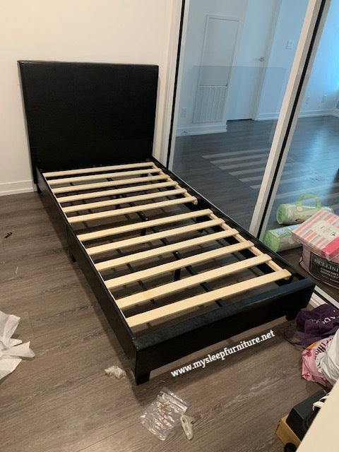 TWIN (SINGLE) SIZE- (UPTOWN BLACK)- LEATHER BED FRAME- WITH SLATS