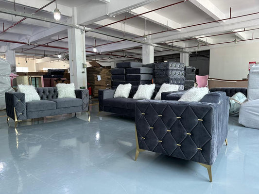 (BO ROLA GREY SLC)- VELVET FABRIC- BUTTON TUFTED- SOFA + LOVESEAT + CHAIR- TEXT OR WHATSAPP 416 319 8851 FOR STOCK AVAILABILITY BEFORE PAYING