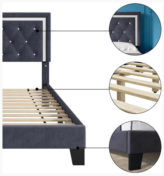 DOUBLE (FULL) SIZE- (LANE GREY)- VELVET FABRIC - CRYSTAL TUFTED- BED FRAME- WITH SLATS