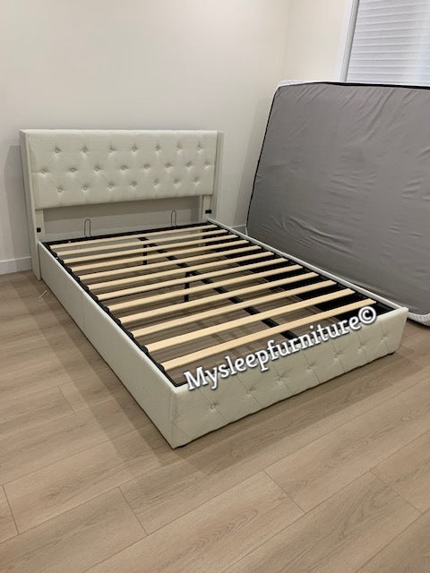 QUEEN SIZE- (5343 GREY)- FABRIC BED FRAME- WITH 4 DRAWERS- WITH LIGHT- WITH SLATS