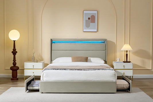 KING SIZE- (JESSY BEIGE)- FABRIC STORAGE BED FRAME- WITH 4 DRAWERS- WITH LIGHT- WITH USB- WITH SLATS