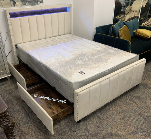 QUEEN SIZE- (MARK BEIGE)- VELVET FABRIC STORAGE BED FRAME IN A BOX- WITH 4 DRAWERS- WITH LIGHT- WITH SLATS