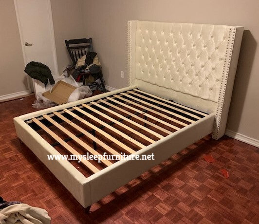 QUEEN SIZE- (2380 OFF WHITE)- BUTTON TUFTED- VELVET FABRIC BED FRAME- WITH SLATS