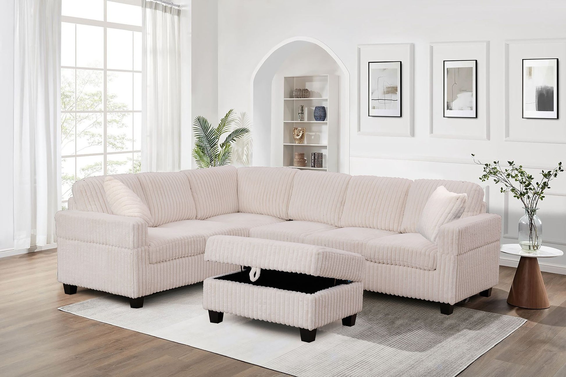 (GILLIAN BEIGE)- 105" LONG- REVERSIBLE- CORDUROY SECTIONAL SOFA- WITH STORAGE OTTOMAN- TEXT OR WHATSAPP 416 319 8851 FOR STOCK AVAILABILITY BEFORE PAYING