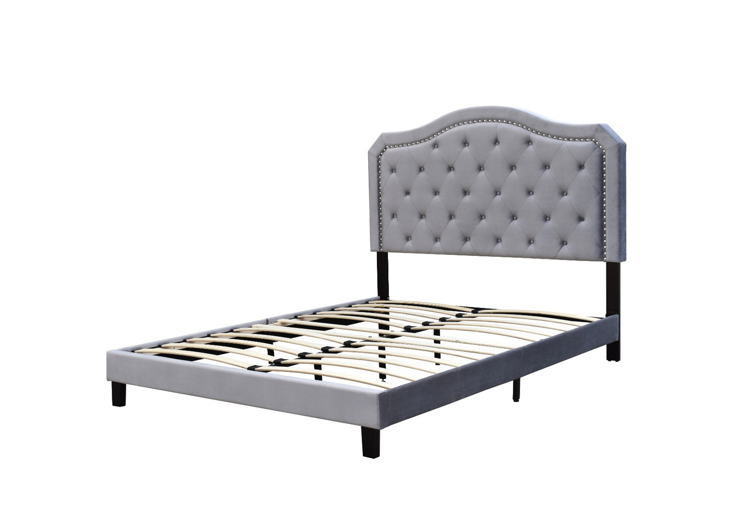 QUEEN SIZE- (HELEN GREY)- VELVET FABRIC- BUTTON TUFTED- BED FRAME- WITH SLATS