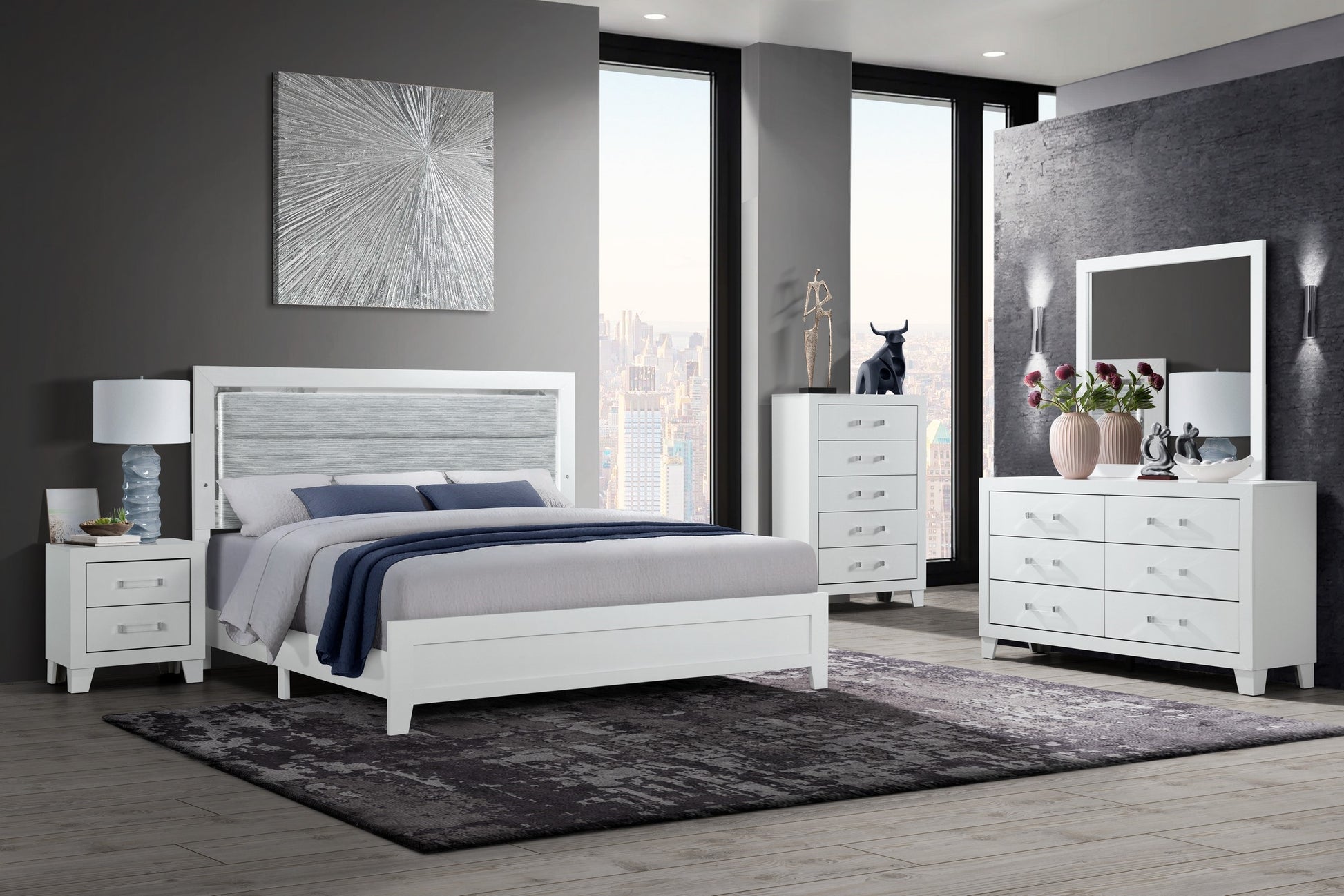 - Set includes Bed frame, 2 Night Stands, Chest, Dresser, Mirror
